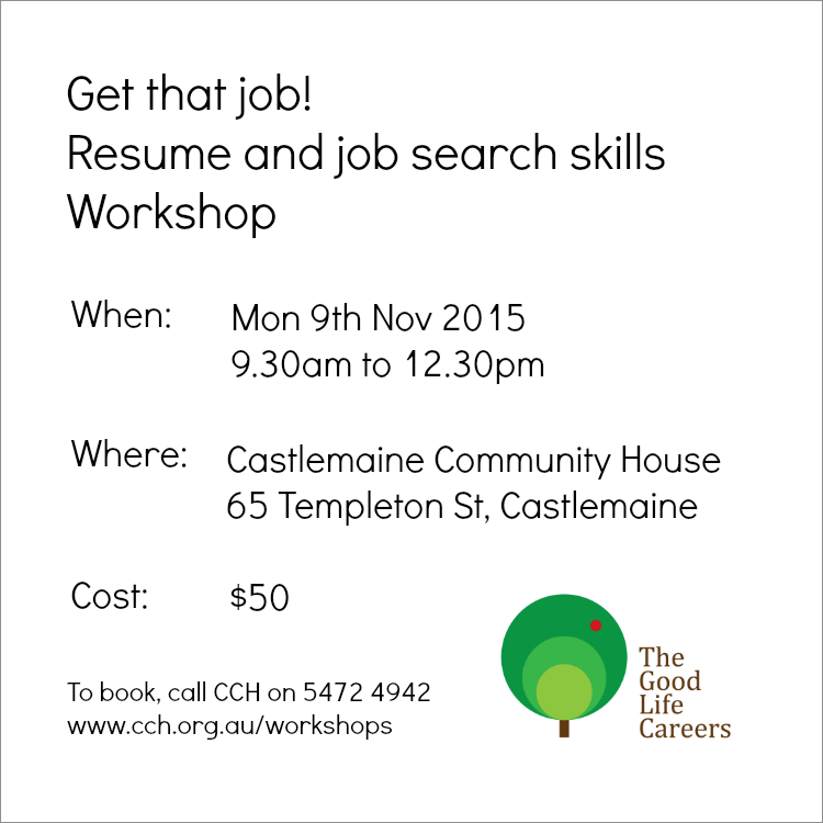 I’m running a three hour workshop to help improve your resume as well as other job search tips. It’s on Monday 9th November from 9.30am at Castlemaine Community House, 65 Templeton Street, Castlemaine. Bring your current resume. Materials and handouts will be provided including a template to write your resume from scratch! Morning tea will also be available.